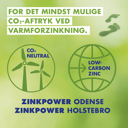 ZINKPOWER Odense A/S and ZINKPOWER Holstebro A/S are the first galvanizing plants in Denmark to operate exclusively with CO2 neutral energy. In addition, low-carbon zinc is used for galvanizing. This zinc is exclusively extracted and produced with green energy. This achieves a CO2 footprint of less than 1 kg of CO2 per kilogram of zinc. In comparison, conventionally produced zinc generates about 4 kg of CO2 per kilogramme of zinc.*