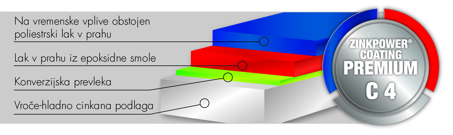 - • Prašno barvanje, sloj 2: nanos z vremensko odporno poliestrsko prašno barvo, svilnato sijajen